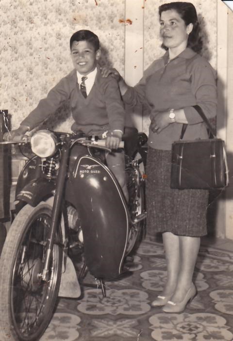 Pasqualina con il figlio Tommaso posano con il nuovo gioiello di famiglia, una Moto-Guzzi